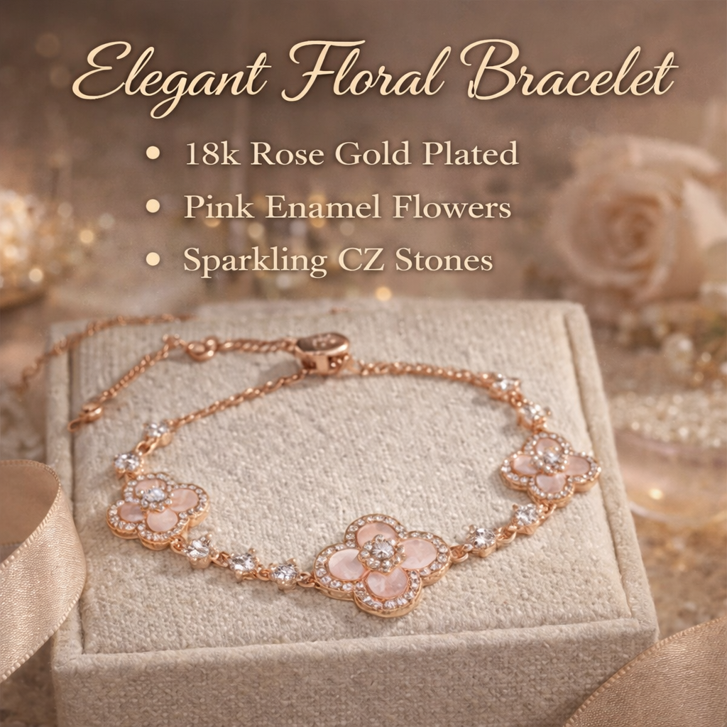 Add a soft, romantic touch to your jewelry collection with this elegant Pink Floral Adjustable Bracelet. Designed with delicate four-petal flower motifs, sparkling crystal accents, and a warm rose gold-tone finish, this bracelet blends feminine charm with refined detail. The soft pink floral elements create a graceful, luxurious look that feels both sweet and sophisticated.