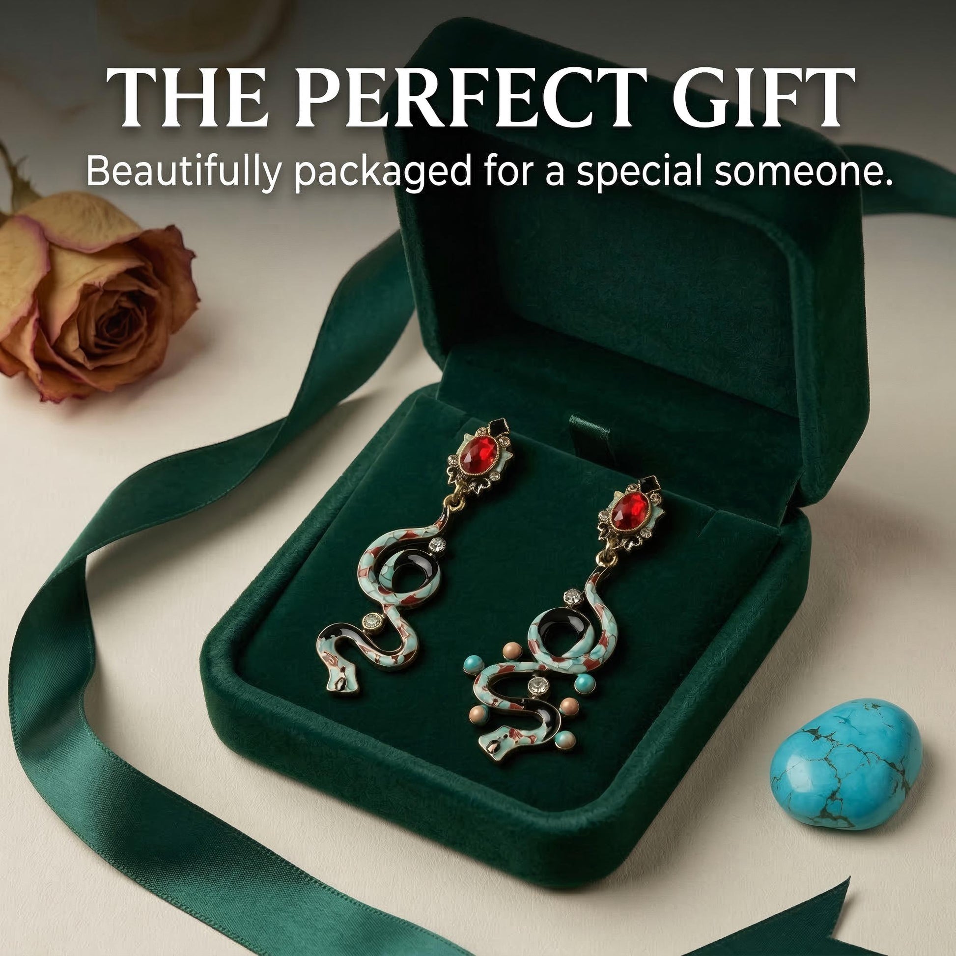 Make a bold style statement with these Vintage Snake Drop Earrings, designed for those who love distinctive jewelry with artistic character. Featuring an elegant serpent-inspired silhouette, rich red gemstone-style accents, and detailed enamel-like patterns in black, red, and soft turquoise tones, these earrings bring together mystery, drama, and vintage charm in one striking design.